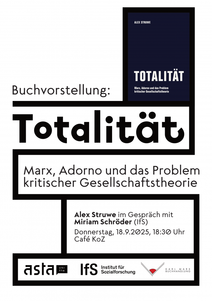 am 18. September 2025, 18:30 Uhr laden wir euch herzlich zur Buchpräsentation von Totalität. Marx, Adorno und das Problem kritischer Gesellschaftstheorie von Alex Struwe außer Haus im Café KoZ ein.